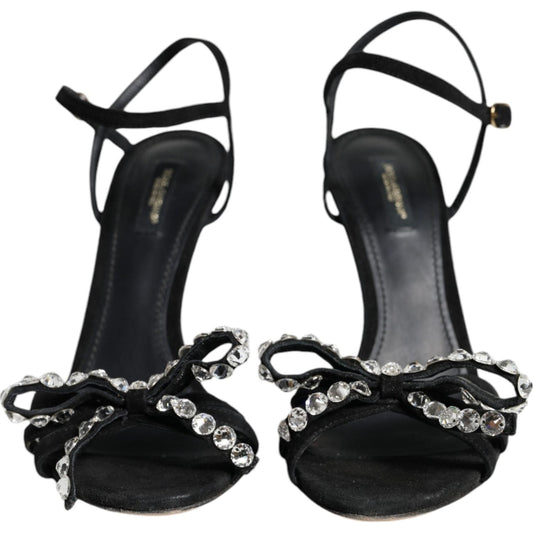 Dolce & Gabbana Black Leather Crystal Bow Heels Sandals Shoes