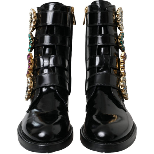Dolce & Gabbana Black Leather Crystal Buckles Boots Shoes